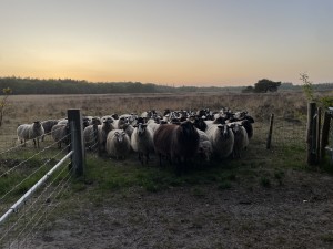 Vanavond ging ik de schapen van de hei halen en voor de nacht veilig in het naastgelegen wolfraster zetten. Dat doe ik, als ze op deze plek staan, elke avond.