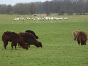 Om bij mijn schapen te komen moet ik, naast wallaby’s ontwijken, wegduiken voor aanstormende alpaca’s. En die spugen, je weet het.